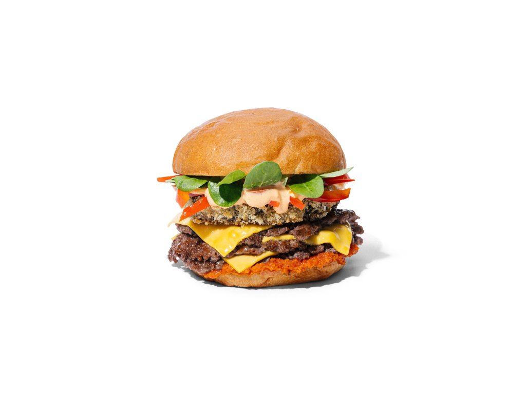 3x 50 g české hovězí (Amaso), smažený lilek, paprika na kyselo, papriková mayo, čedar, polníček, avar