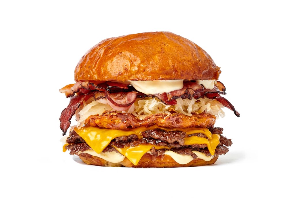 100% čestr (3x 50 g), bramborák, slanina, kysané zelí, čedar, hořčičná majonéza
